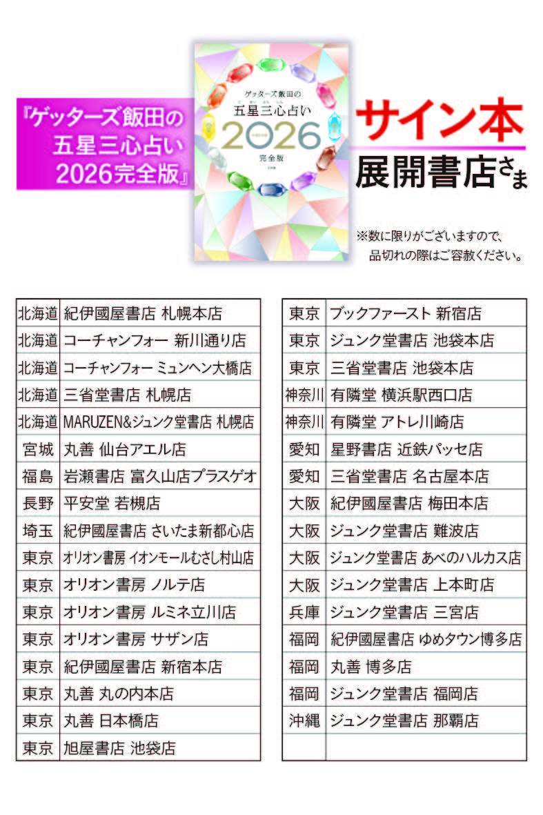 『ゲッターズ飯田の五星三心占い2026完全版』のサイン本のお知らせ